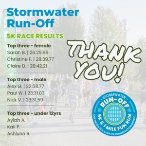 We had a blast and we hope you did too! Over 120 people joined us for our inaugural Stormwater Run-Off on a gorgeous day in early October! Along the course, participants learned about stormwater and the different ways to slow it down, spread it out, and soak it in! Many took part in our stormwater obstacle course, visited our amazing sponsor exhibitors and enjoyed a delicious sandwich from Cocky’s Bagels. Maybe you’ll catch yourself in our photos here!